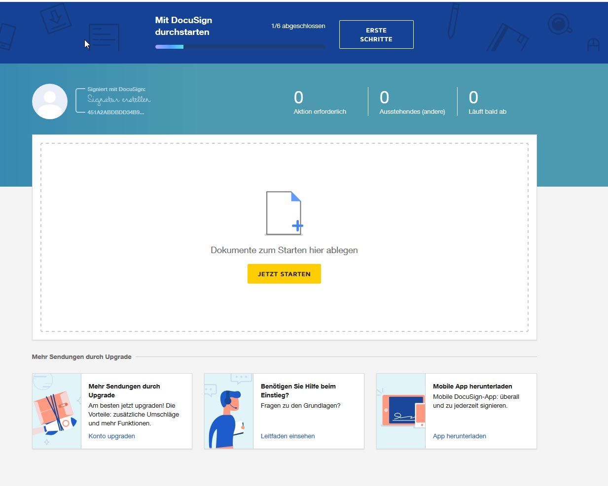 - Dokument wird zum Signieren von Vertragsparnter1 über Docusign hochgeladen